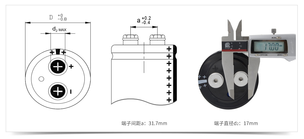 400V5600uF螺栓型電容器端子直徑為17mm,兩個端子間距為31.7mm,螺紋為:M6。