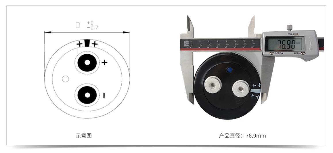 400V5600uF螺栓型電容器產(chǎn)品直徑為76.9mm。