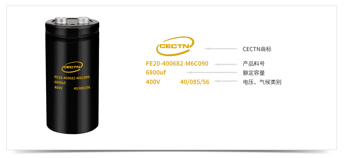 ? ? ? ? 鋁電解電容的料號(hào)又兩個(gè)部分組成,上面是CECTN商標(biāo),下面為電解電容型號(hào),包含訂購(gòu)代碼、電壓、容量、溫度、壽命、安裝方式等信息。詳細(xì)了解請(qǐng)點(diǎn)擊進(jìn)入《凱琦佳鋁電解電容料號(hào)說(shuō)明》頁(yè)面。